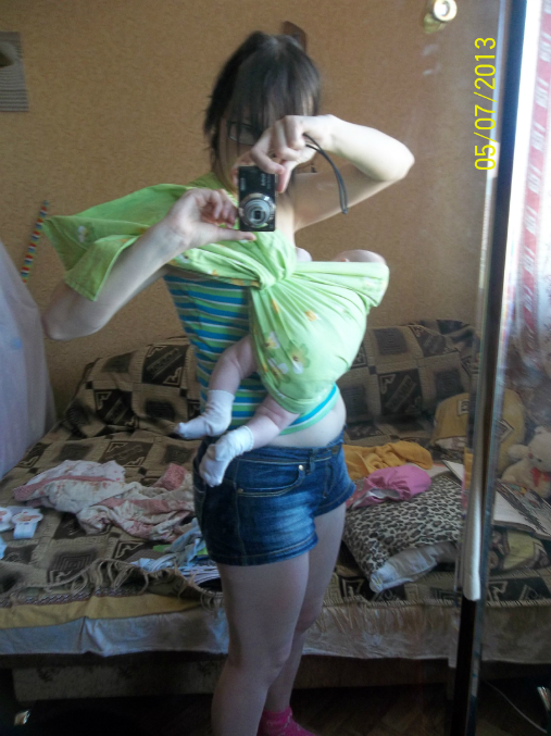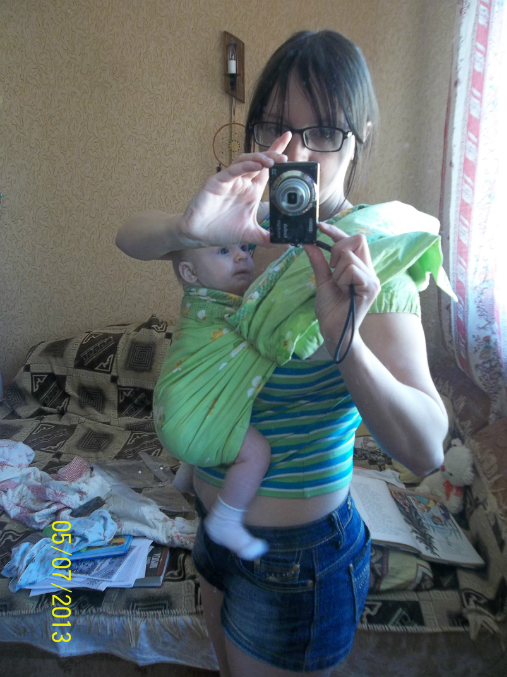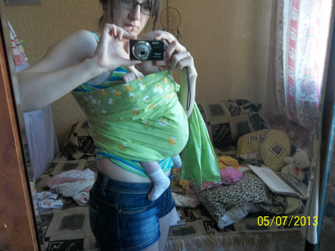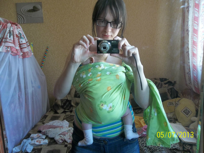 Приобретите нормальный слинг и будет гораздо проще. Этот очень сложно освоить, а так, чтобы полностью удобно, невозможно (у меня был подобного рода слинг со старшим в начале, так что знаю, о чем говорю). Им тоже можно пользоваться, лучше, чем просто на руках, но регулировать крайне тяжело. Последняя Ваша фотка - так недопустимо носить, даже дома, у Вас ребенок может упасть на пол((( поймать, скорее всего, успеете, но лучше не рисковать. Нижний край слинга должен проходить как минимум под коленочками ребенка, а можно даже полностью с ножками укладывать в слинг, если помещается пока.
