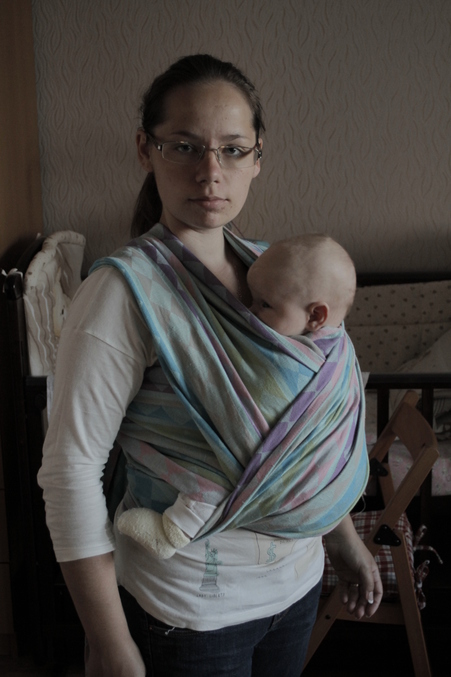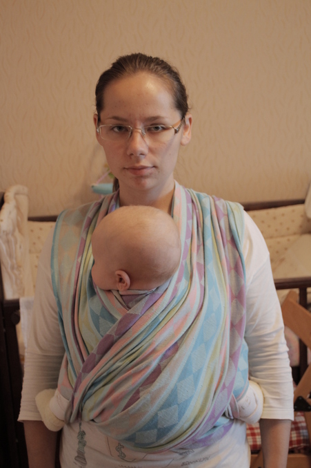 Да, мне тоже кажется слинг не натянут (это по складкам как раз видно). Еще у меня под коленочками проходил слинг (а у вас чуть ниже). А в колыбельке не хотите попробовать поносить?