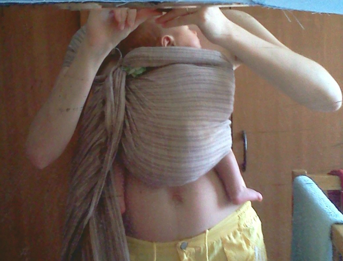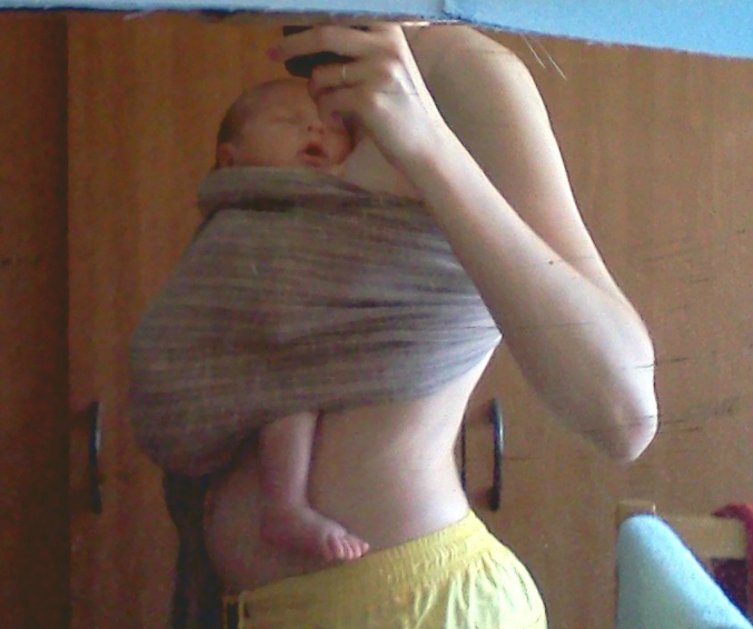 тут посмотрела мастер класс по ССК. Там еще советуют чуть ближе к свободному плечу малыша сажать, т.е. не по центру, как в шарфе, а чуть на полу-бедро. Так должна лучше ткань распределятся