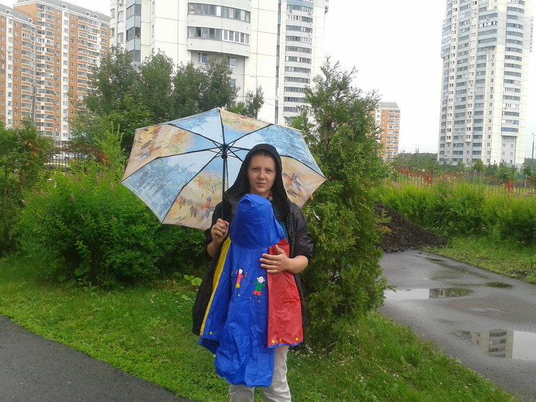 Вот такого странного персонажа сегодня могли наблюдать жители родного Кожухово))) Фото, конечно, уже постановочное. Так как пока мы ждали, пока наш фотограф (бабушка)) освободится с работы, дождик кончился (но не надолго). У себя за спиной застегнула кнопочку дождевика, чтоб ножки не мокли, ну и зонтик, чтоб сверху не капало)) Маша сначала плакала, до выхода на улицу, но потом ничего)) понравилось, даже поспала немного!