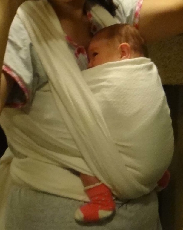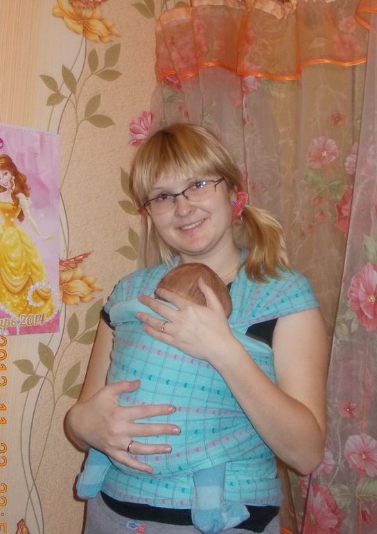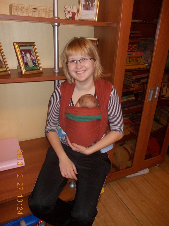 Спасибо :) сейчас тренируюсь (руки у меня из одного места), по-моему основная моя ошибка в том, что я мотаю слабо. Я когда концы подтягиваю, мне кажется ей неудобно и я сильно не затягиваю, а потом она провисает. Да, и концы сзади завязывать не так удобно, но держит реально лучше. Правда ножки мне кажется сильно в стороны разведены. И еще сейчас она в слинге спала и как-то сопит, хотя ее голова к груди не сильно прижата, место для свободы есть... но она ее на ручку свою кладет. Вот скорректированное фото, но пока без валика.