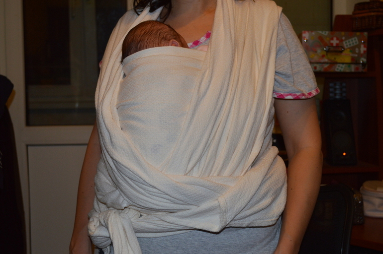 Давайте скорректируем Вашу намотку )Будем ориентироваться на вот эти фотографии из единой инструкции слингоношения:http://www.slingoliga.ru/articles/sling/img/howto/1.jpghttp://www.slingoliga.ru/articles/sling/img/howto/6.jpghttp://www.slingoliga.ru/articles/sling/img/howto/9.jpgС самого начала, новорожденный ребёнок в вертикальном полодении в слинге и просто у Вас на руках находится в позиции лягушечки. Важные моменты, на которые стоит обратить внимание:- ножки согнуты в коленочках, разведены на комфортный для ребенка угол, симметрично расположены. Колени выше попы- таз ребенка отставлен от Вас, что позволяет ребенку согнуть ножки в коленочках, не переразводя их. Таз - низшая точка намотки. Попа находится примерно на уровне Вашего пупка- плечики, верх спинки прижаты к Вам. На фото из единой инструкции на фото в профиль Вы можете видеть, что ребёнок как бы лежит на груди у мамы- поддержка слинга осуществляется по бедрам, тазу, спинке, плечикам, и поддерживает голову в районе шеи- ножки вниз от колен свободны и находятся вне слингаДля новорожденных лучшей намоткой будет КНК с нерасправленными полотнами.По Вашему фото я вижу, что полотна полурасправлены, идут поверх ножек малыша (ножек я вообще не вижу), затем оборот вокруг талии и узел завязан сбоку на кончиках скосов.Разберем методику Ваших действий с исправлением основных ошибок.Ребенок помещается в слинг с ножками наружу. Для этого необходимо до помещения ребенка в слинг подтянуть карман таким образом, чтобы в него мог поместиться Ваш кулак, не больше. Большой карман нам не нужен. Переберите карман гармошкой, чтобы верхний борт был сверху, нижний - снизу.Берете ребенка на плечо, продеваете руку под слинг и ловите ножки малыша. Дгут кармана должен быть под коленочками малыша, Вы плавно опускаете малыша в правильное положение. Должно получиться, что ножки под жгутом, попа нависает над жгутом. Ребенок при этом, еще раз напомню, располагается в правильном положении. Поддерживайте ребенка в районе спины и шейки рукой.После того, как Вы разместити ребёнка правильно, по-немногу натягивайте ткань, найдя верхний борт кармана сбоку. Постепенно равномерно подтягивайте ткань на попу, спинку и т.д. Следите, чтобы положение малыша не менялось. Если нужно, поправьте до первоначально правильного положения.Ткань кармана натяните до макушки ребенка, НО оставьте в районе шеи. В эту ткань нужно будет завернуть маленькое полотенчико, чтобы получился валик.Подтяните с плеч ткань так, чтобы карман был хорошо натянут по всей ширине. Все лишние складки кармана должны остаться под коленочками малыша, сам карман глубоко заправлен между Вами и малышом. По спинке ребенка складок быть не должно.Если не хватает рук, то зажимайте полотна между коленей )Затем полотна с плеч проведите максимально плоскими по бедрам малыша, не под коленками, а по бедрам. Вот здесь у меня поместился палец