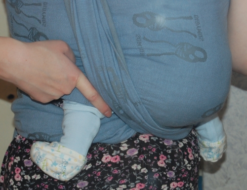 Я вижу переразведение ножек и перепросадку попы. Возьмите ребёнка за голени и сведите ножки, стопы должны быть горизонтальными.Обратите внимание, ножки у малыша в стороны, а жгуты под коленями. Жгуты максимально плоскими должны идти не под коленками, а по бедрам. Посмотрите, у меня на фото поместился палец.