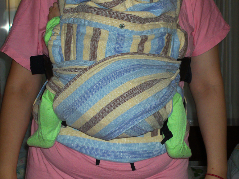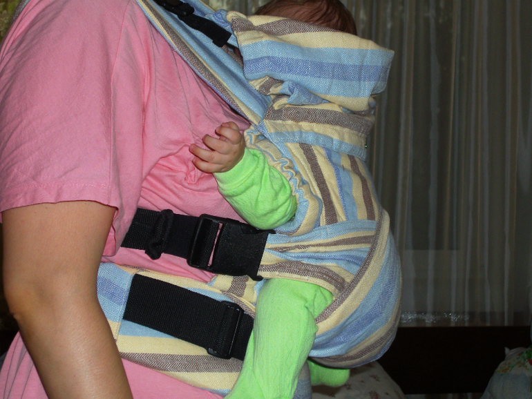 Потеряла Вашу тему, припозднилась с ответом.Приспустите перекрестные лямки вниз под попу, возьмите малыша за голени и, приподнимая вверх, сгибая в коленях, сведите чуть вместе. Так получается придать позу с более отставленным тазом?