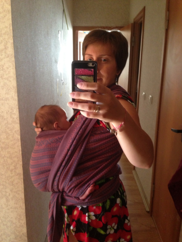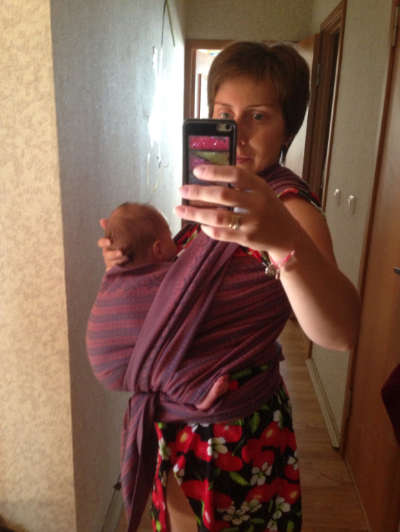к сожалению, намотка ОЧЕНЬ слабая. ребенок висит на верхний полотнах на бедрах. должен держать карман. вся слабина у вас скоро переползет и ребенок будет очень низко висеть. изначально сажайте ребенка в тугой карман ножки ребенка должны быть от коленки свободны . шея-голова ребенка должны быть зафиксирована (можно валиком как на фото). http://slingoliga.ru/instructions/krestnad/