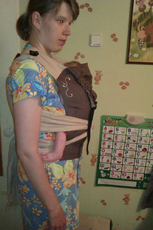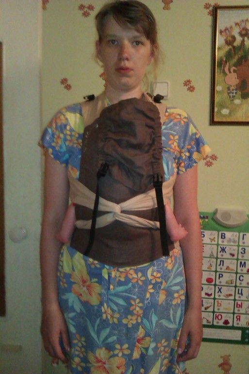 Хорошо. Высоту спинки Вам удалось подстроить под малыша.На фото видно, что в верхней части спинки образовалась слабина. Лучше всего, если Вы сделаете перекруты лямок на плечах, перекрут в направлени к себе, то есть от ската плеча к шее. Это подтянет верх спинки.Подголовник сверните трубочкой и оставьте под шейкой малыша. Если не предусмотрены резинки на концах, то можно использовать резинки для волос, чтобы закрепить этот валик с двух сторон.И тогда с поддержкой головы и верха спинки разберемся )По поводу разведения ножек. Когда сужаете спинку складочками, перевяжите её тонкой ленточкой, чтобы они не разъезжалась. Располагайте малыша с разведенными на комфортный угол ножками. И ,если ширина спинки будет не очень большой (ленточка не даст разъехаться), то когда накидываете спинку на малыша, ножки не придется разводить еще больше. Спинка просто пройдет между ножками и будет облегать таз малыша.В конце намотки еще раз пробуйте скорректировать ножек, сведя коленочки вместе. Если не получается, подсовывайте руки между малышом и слингом, и корректируйте положение таза и бедер малыша относительно ткани слинга. Возможно, ткань достатчно плотная и не очень податливая.