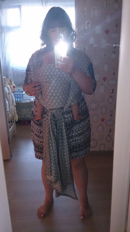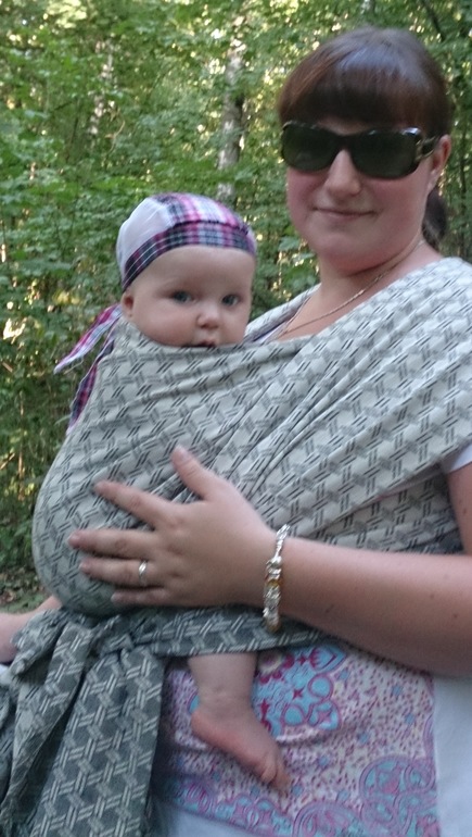 В общем, опытным путём, я установила, что этот шарф хорошо мотается в намотку "Кенгуру". Именно в ней мы и вышли на прогулку в 35 градусную жару. В целом, всё прошло неплохо - именно в этом варианте намотка не ползла, я почти не подправляла её, детка моя поглазела, поспала, проснулась, поглазела ещё, и мы благополучно вернулись домой.