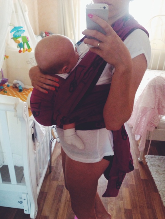 на мой взгляд у вас очень слабо шарф завязан, вот ребенок и болтается, ну и соответственно ему это не нравится. Мы в вашем возрасте мотались крест под карманном, и ножки у нас не были так разведены