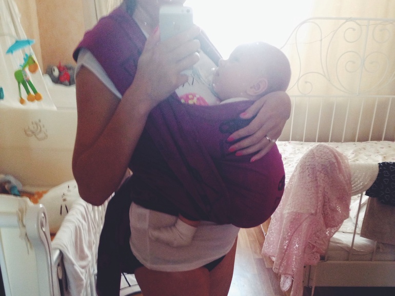 Приподнимите малыша рукой, и сразу станет понятно, где слабина.Стоит глубоко между собой и малышом заправить карман, всю нижнюю треть. Ножки от коленей и ниже должны быть свободны от ткани.Жгуты, идущие с плеч, максимально плоско стоит расправить по бедрам малыша. Когда карман будет плотно подтянут по всей ширине полотна, то и жгуты будут держаться на бедрах.Высота намотки — попа малыша на уровне Вашего пупка.Малышу может не нравиться из-за гиперразведения ножек и перепросадки попы.