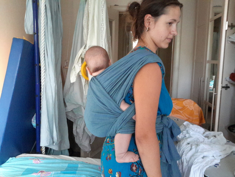 я не вижу на вашей груди полотна. намотка слабая, нетугая. +складки на спине ребенка, все ннужно уводить под попу, на спине все должно быть плотно натянуто и гладко.. попу просадить можно поглубже.