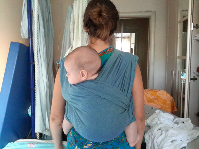 Расправляйте полотно по груди, это позволит чуть повыше разместить малыша. Желательно, чтобы носик малыша был на уровне Вашей шеи. Это позволит несколько наблюдать малыша боковым зрением при повороте головы в сторону. Или при помощи зеркальца.Если высота намотки будет низковата, то попробуйте освоить намотку Рюкзак, она позволяет расположить малыша практически на любой высоте.