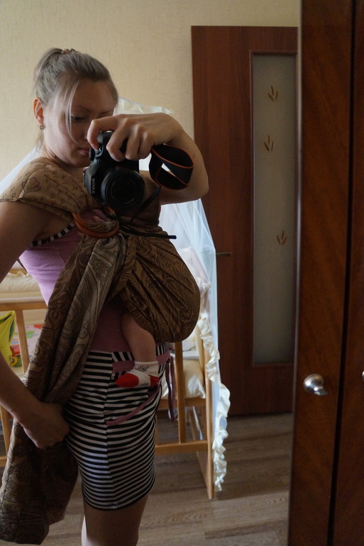 Достаточно неплохо. Чтобы кольца не ползли вниз с первоначального уровня, не забывайте из-за спины вытягивать соабину вперед до того, как помещаете малыша в слинг. А когда ловите ножки, чтобы посадить на жгут, делайте рукой движение из-за спины к кольцам, натягивая ткань.Поменьше стоит вытягивать ткань наверх. Складочки ткани возвращайте вниз под коленочки малыша, затем нижнюю треть заправляйте между собой и малышом.