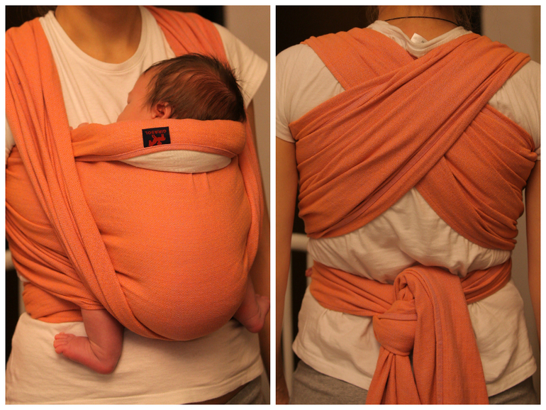 Сама вижу, что справа боковое полотно ушло под коленку, и слева тоже хочет. И сама намотка получилась не очень тугая, особенно сверху - довольно сложно удержать ребенка одной рукой, а другой туго притягивать полотна, чтобы при этом то, что уже притянуто, не расползалось (((( М-позиция хотя бы получилась? Ребенок вроде не протестует, но очень не хочется навредить ему своей криворукостью.