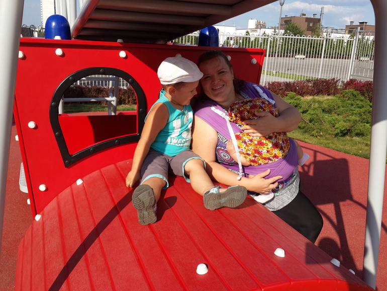 Тем более жили еще в Магадане, была машина и вобщем то особой необходимости в слинге у меня не было. Родилась дочка. К тому моменту мы уже переехали на ПМЖ с Москву, и встал вопрос КАК гулять с двумя детьми, одному из которых совсем немного ( когда задумалась Юльке было около 3 месяцев), а у второго шило в попе и глаз да глаз за ним. Вариант с коляской отпадал сразу, тк при необходимости побежать за старшим, коляску не бросиш, а с коляской о мобильности говорить не приходилось... и тут я вспомнила о слингах и рюкзачках. Я думала и о шарфе...но его пугающие метры ( а учитывая мои пышные формы еще больш метров) сразу поставили крет на этой мысли ( Хотя признаться, я бы попробовала намотаться...просто попробовала бы..ради интереса и сравнения..я вообще люблю все новое и потом сравнивать и анализировать.. а если руки дойдут и ощущения отзыв написать на ББ)