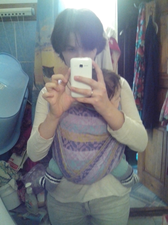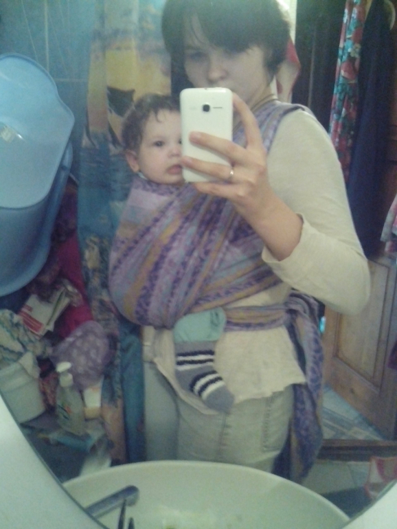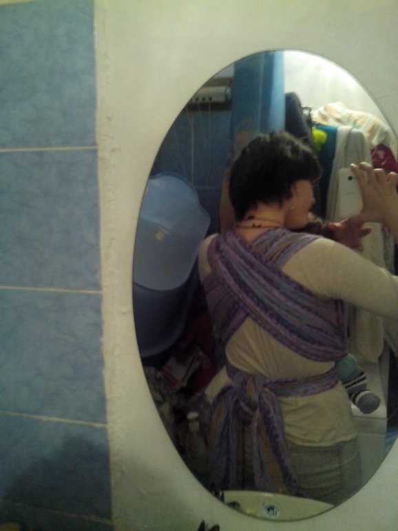 Я думаю, у Вас тонкий шарф для веса 9 кг ) Расправляйте полотна от коленки до коленки с перекрутом на плечах. Проверяйте, нет ли перенатяжения в районе подколеней.