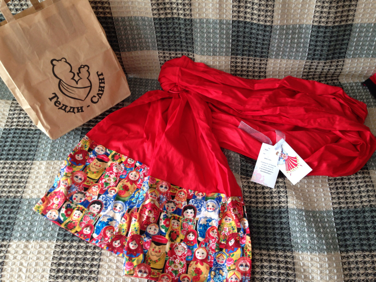 Слинг с кольцамиТедди слинг на кольцах очень стильной расцветки ярко красный с матрешками!!!абсолютно новый!не одевали ни разу!есть все бирки,пакет,инструкция!покупала в чудо маме!в подарок новая одежка на малыша до 2-3 месяцев!один комплект.где матрешки там удобные кармашки.небольшой торг уместен!могу выслать почтой в любой город.