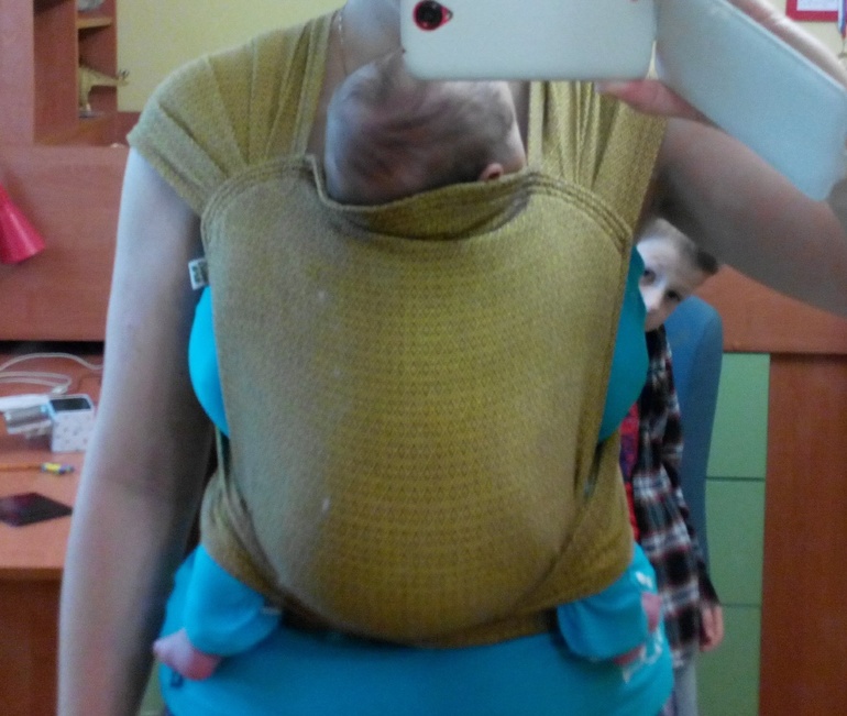 Очень неплохо ) Ширину спинки Вы можете зафиксировать ленточкой, если не делали так. В конце намотки возьмите малыша за голени и чуть сведите ножки вместе.Ножки маленькие, поэтому попробуйте завести лямки из-за спины сразу под ножки. Чтобы не фиксировать лямками колени и ножки ниже коленей.