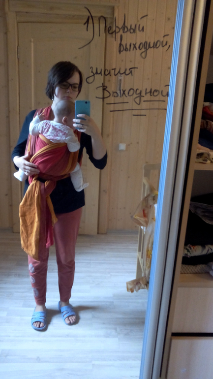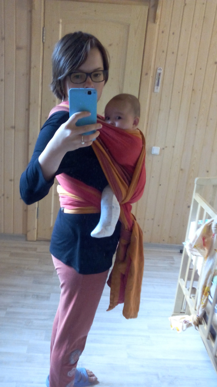 Ульяна, это карман под крестом. Так всегда наматывается намного свободнее, чем крест под карманом. Эта намотка поэтому считается сложнее и неудобнее. Она подходит, когда уже ребёнок постарше, и ты знаешь, что хочешь намотать, чтобы сидел пониже. Для малышей лучше то по ссылке — сначала наматываешь, потом ребёнка сажаешь. И лямки внутрь делаешь, а не сверху.