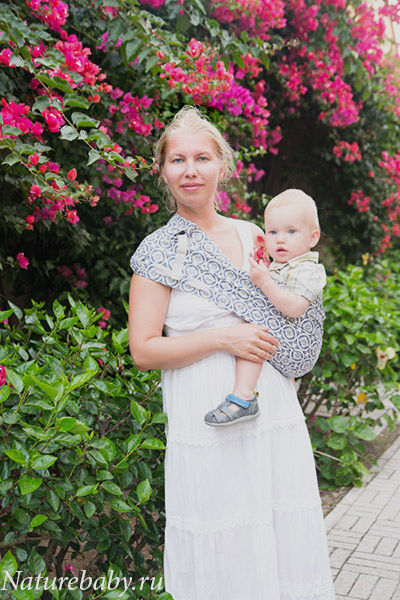 Слинг с кольцами: примерно двухметровый отрез ткани, с одной стороны которого вшиты кольца. В виде, готовом для использования, слинг с кольцами представляет собой петлю, которая вешается на плечо мамы (или папы, или даже бабушки, но для удобства мы будем писать слово "мама", все-таки именно мамы чаще всего носят малышей в слингах). От колец, которые располагаются на плече, висит свободный хвост слинга, потянув за который мы можем отрегулировать величину петли. Высокой или полной маме понадобится петля больше, чем невысокой и худенькой. Что нам нужно знать в отношении ношения малыша в слинге с кольцами? Ребенка в нем можно носить с рождения. Положение может быть и горизонтальным, и вертикальным (живот малыша к животу мамы). Хотя, на наш взгляд, носить новорожденного малыша на животе вертикально - не самый удобный вариант. В горизонтальном положении ребенок располагается точно так же, как на руках у мамы, поэтому в слинге с кольцами удобно кормить. Минус слинга с кольцами в том, что нагрузка (вес малыша) ложится на одно мамино плечо и частично на спину, а тяжелого ребенка, конечно, на одном плече нести тяжелее, чем на двух (сравнимо с тем, держите ли Вы ребенка одной рукой или двумя).