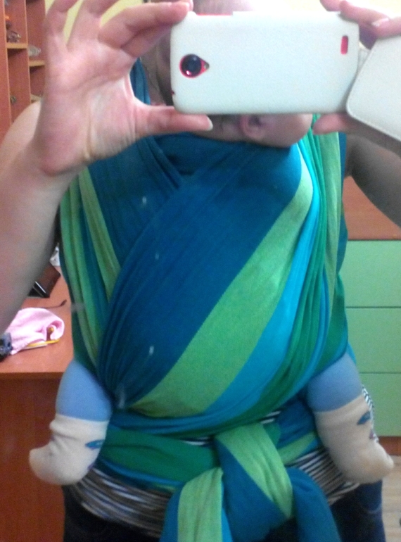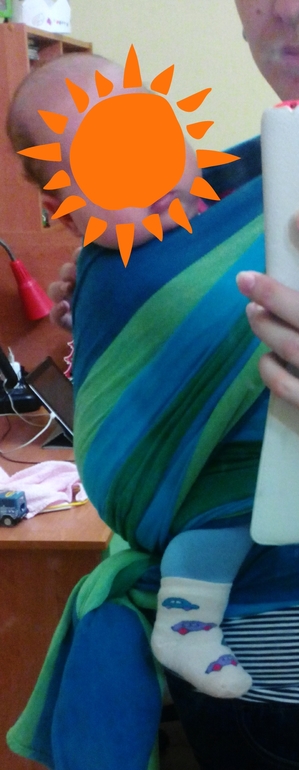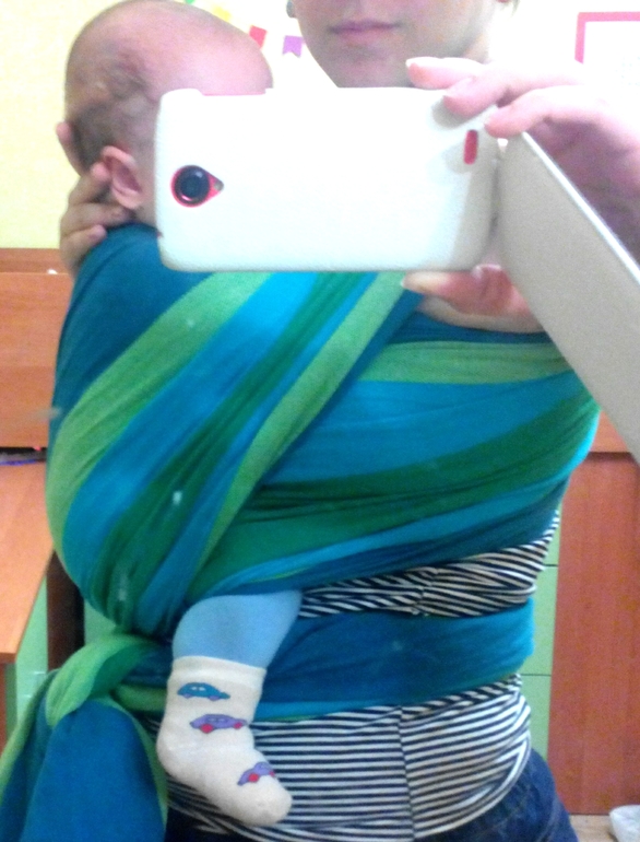 Карман стоит делать глубже. Для этого заправляйте всю нижнюю треть между собой и малышом. А если расправляете полотна, то и ткань полотен. В конце берите малыша за голени и сводите колени вместе. Таз лучше отставится, плечики автоматически прижмутся лучше. При необходимости подтяните слабину верхней трети кармана.