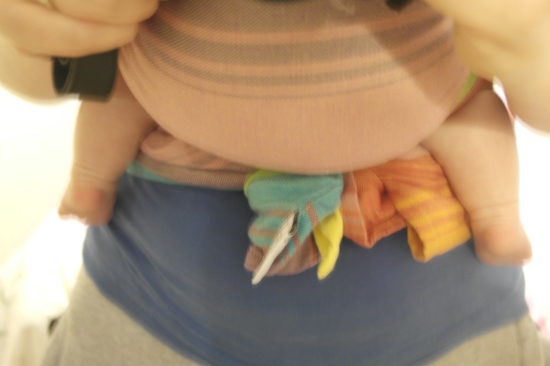 Вопрос вот в чем. У меня в этом размере только вот так концы вперед выводятся. Сзади неудобно под одежду носить совсем, очень узел большой получается. Когда вот так впереди завязываю, ничего не разваливается вроде, но колыбельку сделать не могу.