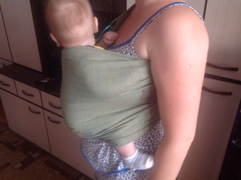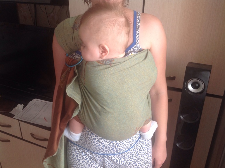 ножки от коленей и ниже должны быть свободныот ткани. Между собой и малышом стоит глубоко заправить карман, подтянуть всю нижнюю треть равномерно и проверить, не впивается ли нижний борт под коленочки.Вцелом, посадка неплохая. Стоит изначально вытягивать слабину из-заспины, удобно располагатьплечо слинга у себя на плече, и вытягивать ткань на спинку малыша в направлении к кольцам. Тогда у Вас со стороны от колец не будет лишней ткани, как сейчас.