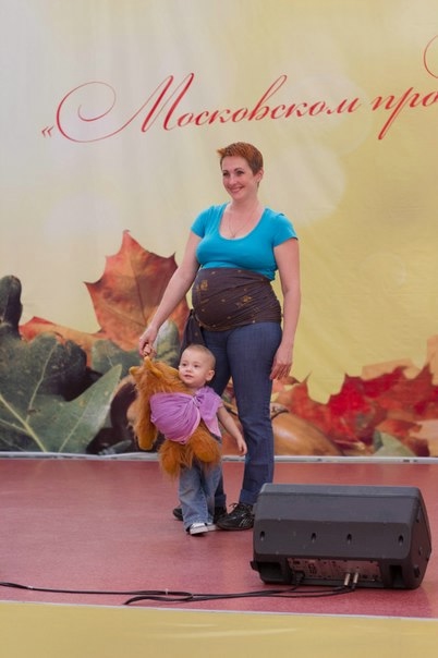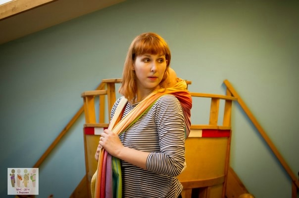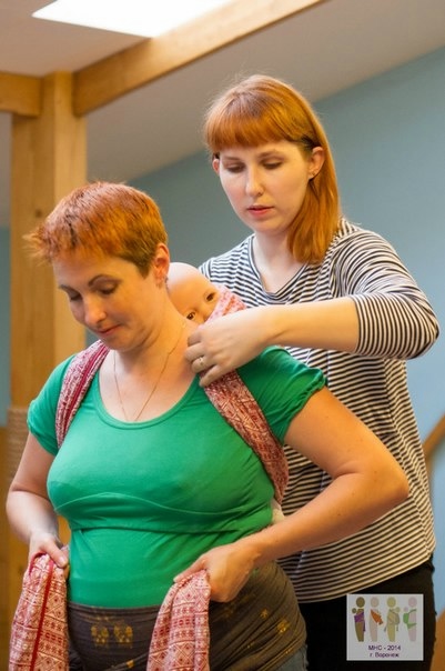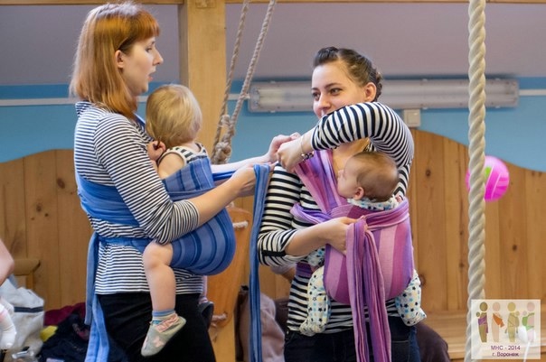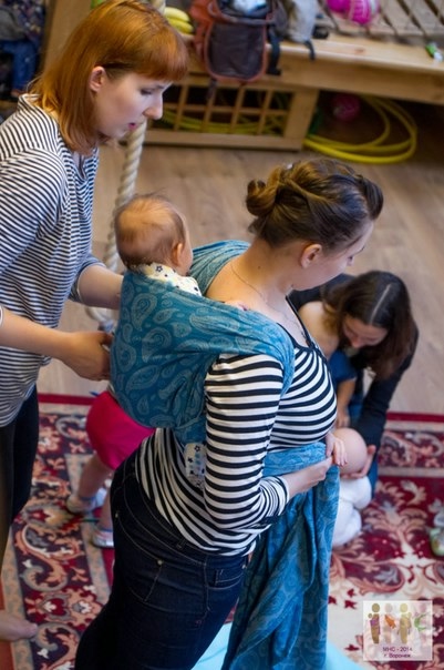 Встречи провели слингоконсультанты Евгения Черненко, она научила мам новичков намоткам, и Елена Караваева (это я) учила мам заспинным намоткам.