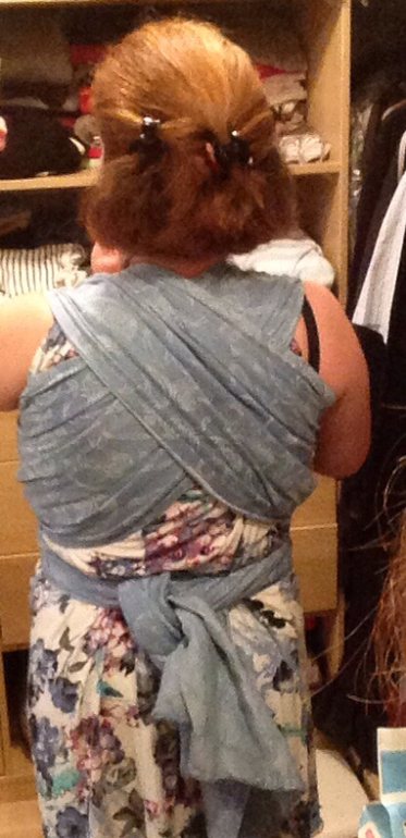 Когда лямки заводите назад, завязывайте двойным плоским узлом.Сильно притягивать не нужно, малыш уже держит спинку и вполне может отклоняться. На фото хорошо прижаты плечики. Если малыш уснул, подтяните верхнюю треть кармана, чтобы обечпечить плотное притяжение плечиков.
