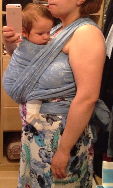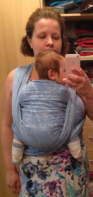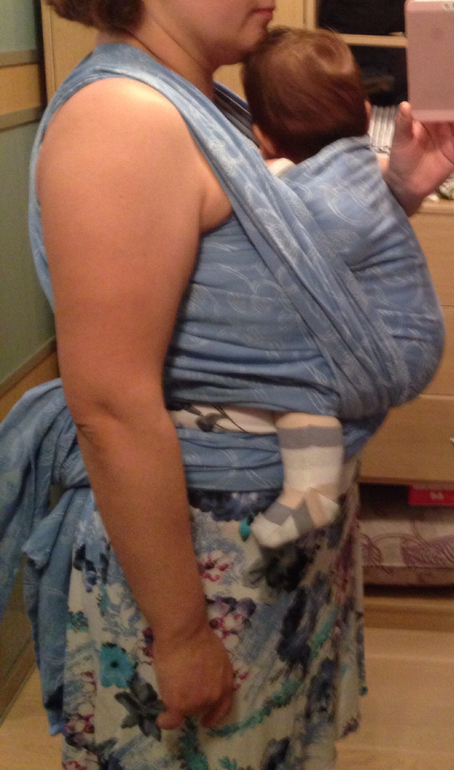 Заправьте всю нижнюю треть между собойи малышом. А по спинке не нужны лишние складочки. Чтобы подтянуть серединку, находите на плече нужную полосочку ткани, и её подтягиваете. Края никто не тянет, тянут полоски ткани рядом с бортиками. Можно на плече перебрать ткань гармошкой — подтянули краешек, ближний к шее, передали в кулачок, и та к подтягиваете до второго края. Всегда стоит держать натяжение. Если подтянули и отпустили, то подтянуть придется заново.Еще есть небольшая асиметрия ножек. Но это, скорее всего, из-за слабины со стороны нижней ножки.