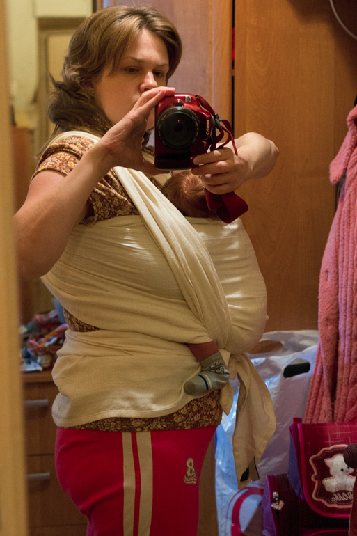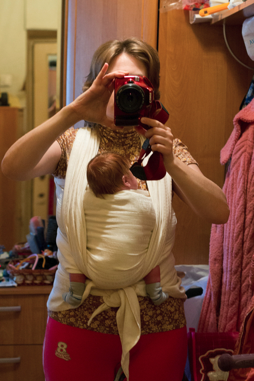 Сбоку хорошо видно, что не подтянута нижняя треть. Подтянитек тщательнее карман по всей ширине полотна.Складки по спинке малыша убирайте между собой и малышом глубоко. Если нужна поддержка головы под шеей, то скатайте валик.Узел завязывайте ДО скосов сзади, плоский двойной. Если нужно, после узла выведите вперед хвосты и завяжите одинарным узлом.Если скос попадет в узел, то намотка будет ползти.Полотна, идущие с плеч, необходимо максимально плоско расправить по бедрам малыша, а не оставлять под коленками. Сейчас эти жгуты держат у Вас всю нижнюю ненатянутую треть кармана.
