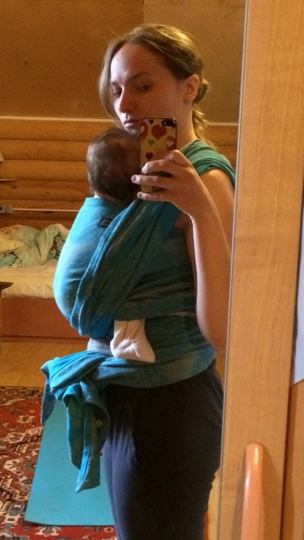 По высоте намотки ориентируйтесь на то, чтобы попа малыша была на уровне Вашего пупка.Есть асиметрия в положении — проверяйте на одном ли уровне плечики и ножки.Ножки переразведены, на мой взгляд. После того, как закончили намотку, возьмите малыша за голени и сведите колени вместе.Ползунки — могут натягиваться на пльчиках и создавать дискомфорт.Если малыш отклонился в сторону, поправьте его до симметричного положения рукой, и подтяните слабину. Подтягивать нужно не бортики! А ткань по всей ширине кармана. Отступили от верхнего бортика пару см, подтянули полосочку ткани, передали себе в кулачок другую полоску ткани, и так до самого нижнего бортика. Нижний бортик не перетягивайте. Важно не терять натяжение, когда подтянули полотно.Заправляйте карман глубоко между собой и малышом, всю нижнюю треть и освобождайте ножки малыша от ткани от колена и ниже.По фото вижу, что есть слабина в нижней трети кармана, её видно сбоку. Это может давать дополнительное напряжение в пояснице и возможность малышу выпрямить ноги.Двойной узел — плоский, сзади. Вперед выводите лишнюю длину, но после узла.Так, как у Вас сейчас завязано без натяжения и спереди может давать возможность намотке ползти.Что хорошо — это что жгуты, идущие с плеч, расправлены по бедрам малыша. Колени выше попы.