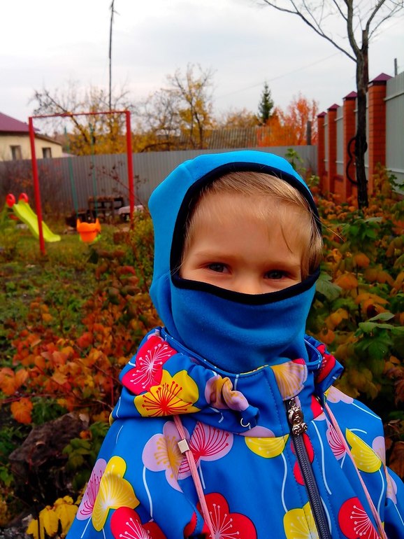 Шея закрыта и не нужна манишка, можно под комбез или слингокуртку одеть с тонкой кофточкой. Ну а самое главное можно поднять «забрало», которое не только от ветра и мороза защищает, но и превращает в настоящего ниндзя! "