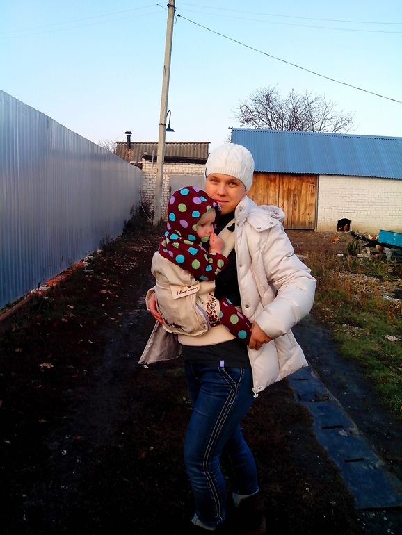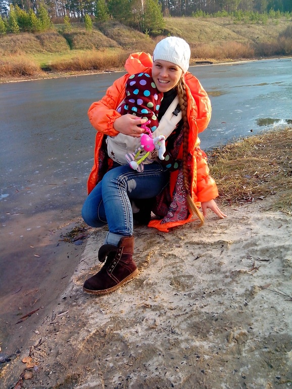 Одеваем слингокуртку, я побоялась, что Мира замерзнет в одном флисовом костюме.