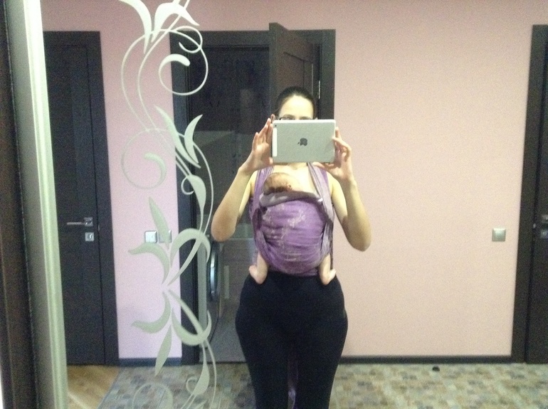 Мне намотка не нравится. Спинка перекошена, на спинке складки... жгуты...такое ощущение, что малыш только на жгутах и держится. Попробуйте посильнее примотать, всю лишнюю ткань собрать под попой. если делаете валик под голову, то делайте его симметричным. И я бы подняла всю намотку целиком повыше. для этого, ослабьте намотку, приподнимите малыша, соберите все лишнее вниз и подтягивайте лямки. Соберите их в гармошку, чтобы могли легко найти и поправить место слабины.