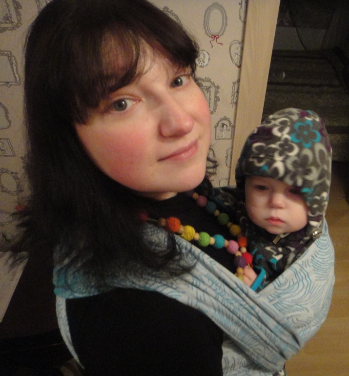 Итак, жаккард от Фрогов. Новинка. Я ухватила, по-моему, на следующий день, как они появились на сайте. Вчера в первый раз "вышли в свет" в нём под слингокурткой. Первое впечатление - красивый! У меня голубой цвет- когда мотала, привиделись снежинки на голубом небе) Или зимние узоры на стекле) Шарф плотнее, чем обычные тканые Фроги (типа амбера, амазонита, аметиста и иже с ними), но тоньше опала и агата. И в этом их прелесть! Мы сейчас в идеальном весе (8кг) - нам пока ещё не нужен грузовоз, подходит практически любой шарф. Но тонкие Фроги я не могла носить уже полтора месяца назад, т.к. ну очень тонко.