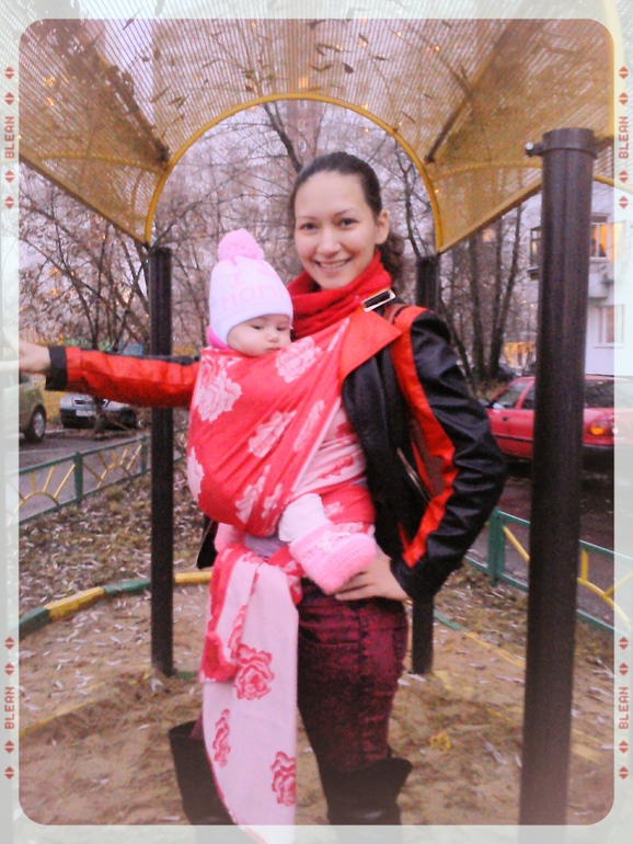Мягкий, младенчиковый шарфик прибыл ко мне по обмену- потрясающей расцветки, подходящей к половине моего гардероба (очень жалко,что не попал раньше-именно этим летом и осенью в моем гардеробе преобладают красные цвета), с одной стороны ярко-алый, с другой серебристо-белый. С не менее потрясающей кармой- за два часа прогулки Уля поспала 20мин, но при этом даже не пикнула и не пыталась вырваться наружу:). И потрясающий на ощупь-нежный,мягкий,гладкий....тактильное наслаждение просто!)