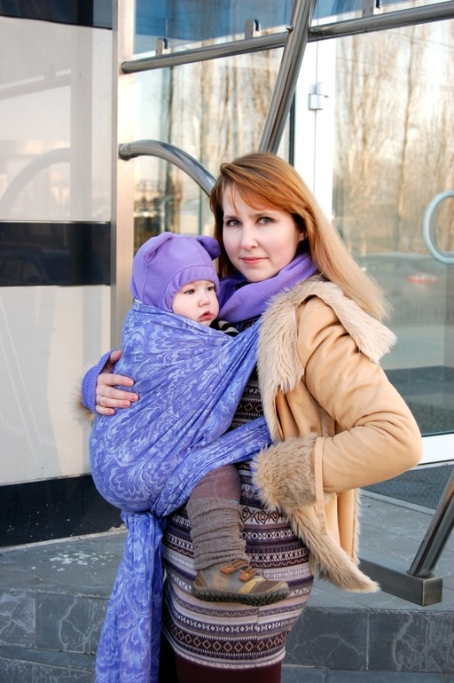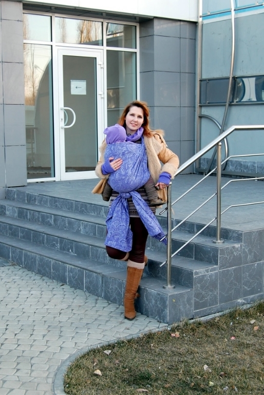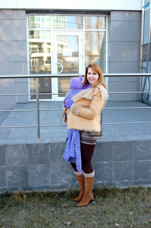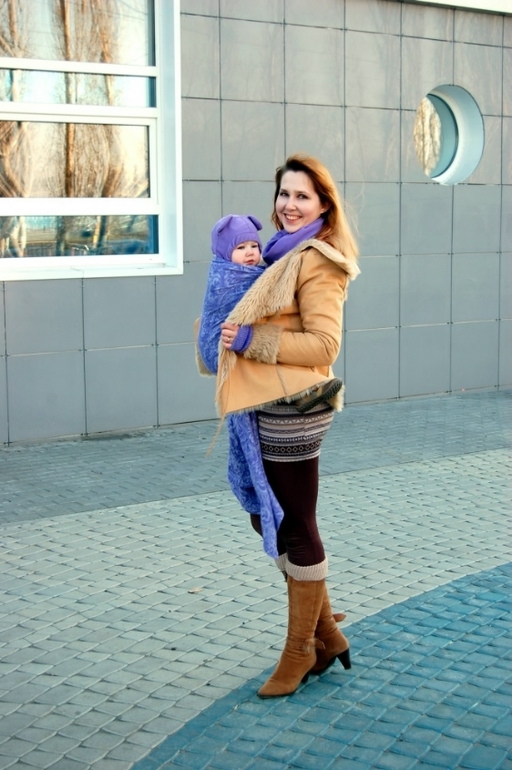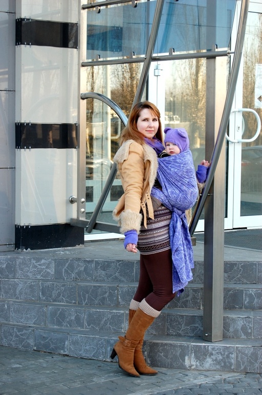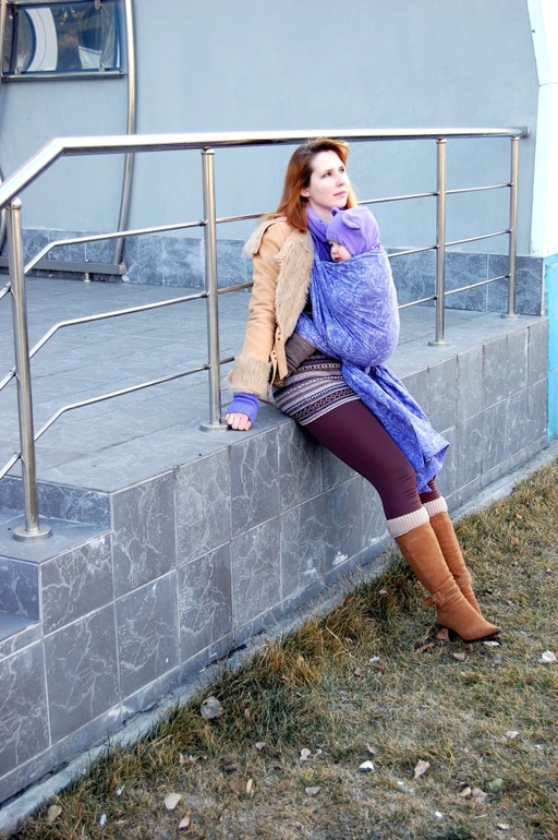 Нет-нет, как же так... образ завершает слинг-шарф холодного лилового цвета Natibaby Pavo со льном, в размере 5.