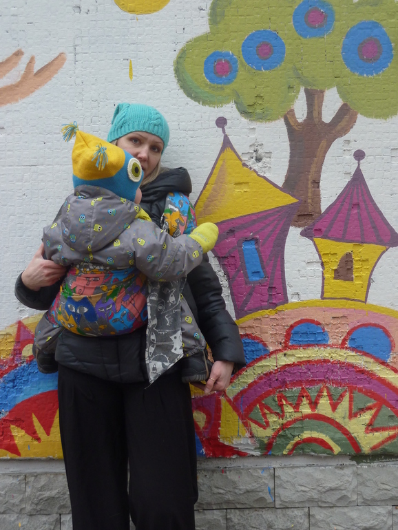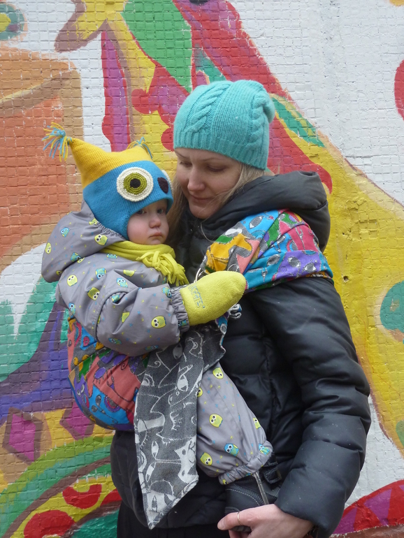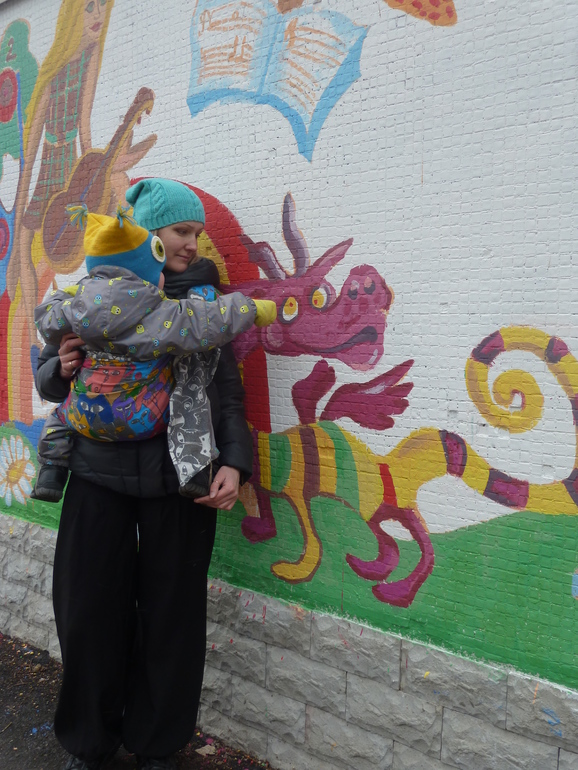 В конце прогулки палантин с помощью вложенных колец превращается в ССК и несёт уставшего детёныша домой. Мы часто проходим мимо этой весёлой стены местной школы. Она хорошо отвлекает и успокаивает моего разбойника