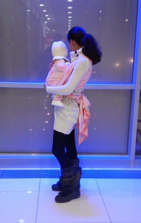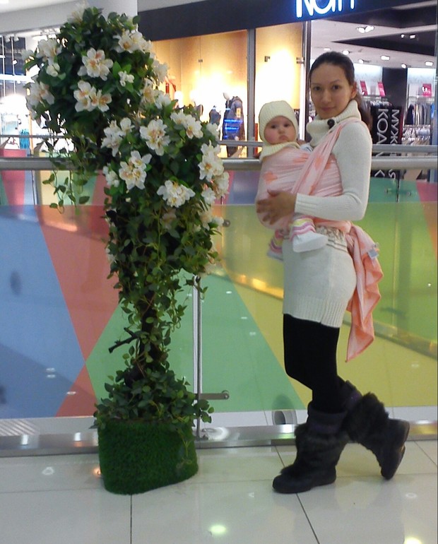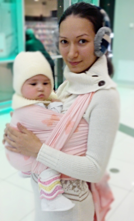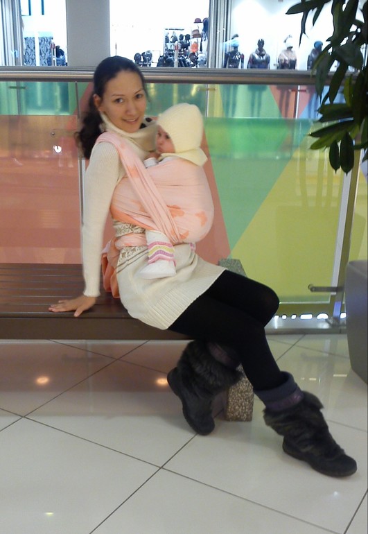 И, конечно же, шарф....Приятного персикового цвета, абсолютно девчачий и младенчиковый. Грузовозным лично я его назвать не могу, но семикилограммовую Улю в течении 1,5-2х часов несет легко и с достоинством. Дольше уже тяжеловато.