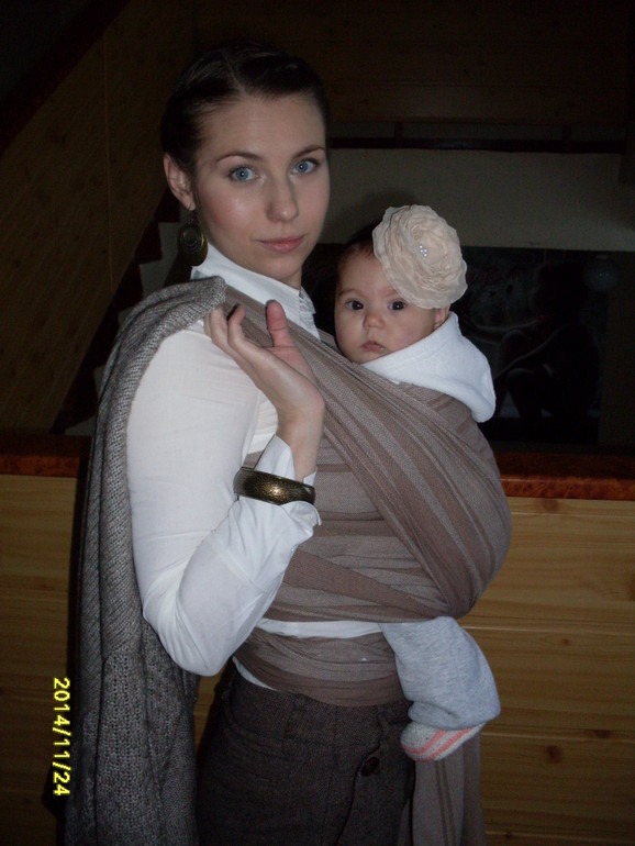 К нашему комплекту идеально подошел слинг- шарф LittleFrog Amber. Шарф универсальный как по цветовой гамме, так и по "техническим" характеристикам. Спокойный такой, двухцветный полосатик. Мне он кажется достаточно плотным, довольно скользким, требующим особой тщательности в намотке. Долго не могла к нему приноровиться, но зато теперь, когда подружились, использую его чаще остальных.