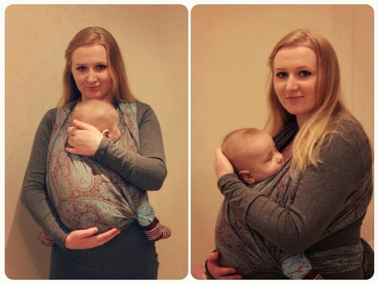 Намотка "крест под карманом" у меня не не вышла совсем, после пяти попыток я бросила это дело. К слову, у меня у самой шарфик Ямми Мамми, он более скользкий и плотный, намоточка КПК в нем прямо таки подъезжает под малыша.
