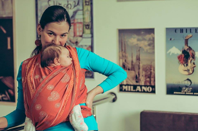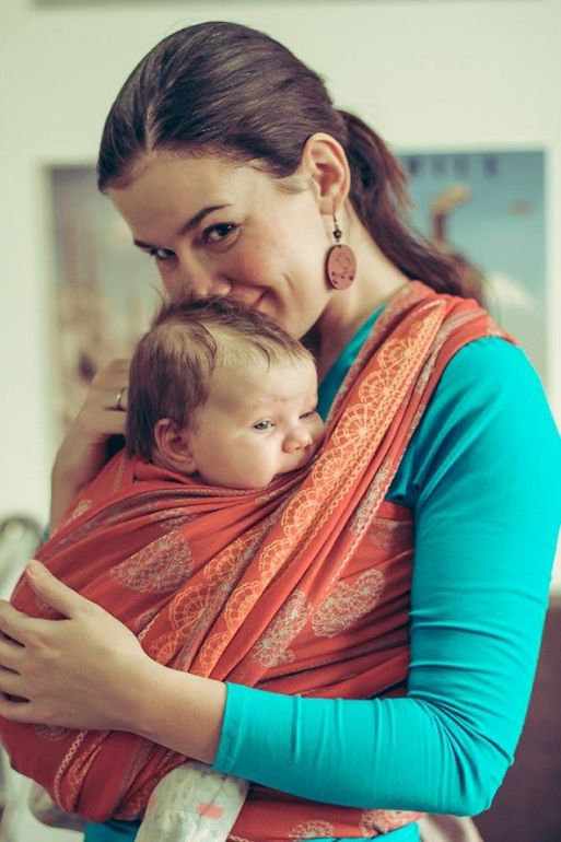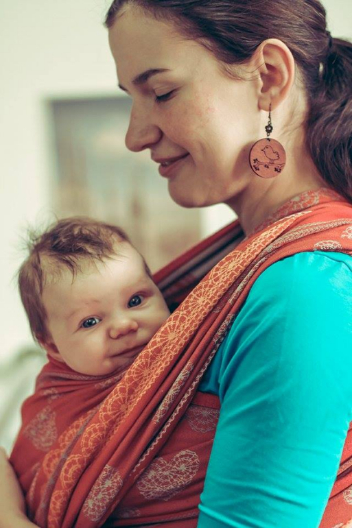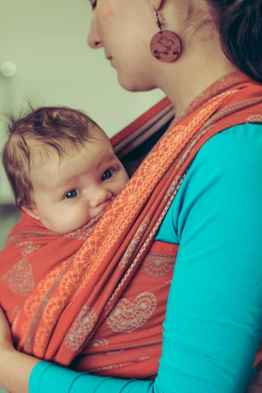 Немного про шарфик: это первый слинг, который я купила еще до рождения Маши. Влюбилась с первого взгляда и навсегда. При дневном освещении он ярко-красный, название "Вишневое кружево" подходит ему как нельзя лучше. А в помещении при теплом электрическом свете он становится ближе к оранжевому. Создается ощущение, как будто это не один слинг, а два. И оба - очень парадные.