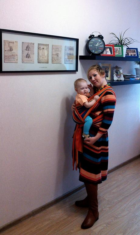 Итак, для создания образа я выбрала Катю, чтобы добавить еще ярких полос в серую осень, я одела яркое гв-френдли платье h&m, удачно купленное лет пять назад и рыжие сапоги. Из аксессуаров я подобрала яркие слингобусы, выигранные на вебинаре про мифы гв, цвет очень удачно подошел к слингу. Обручальное кольцо и браслет, подаренный мужем, всегда со мной. В ушах серьги-гвоздики розового цвета, на фото их почти не видно. Асимметричная стрижка тоже является неким акссесуаром. На Софии футболочка и колготки в тон полосок на платье, и любимые чешки Еbooba с совенком, бегать в них по квартире очень удобно, ножки не скользят.