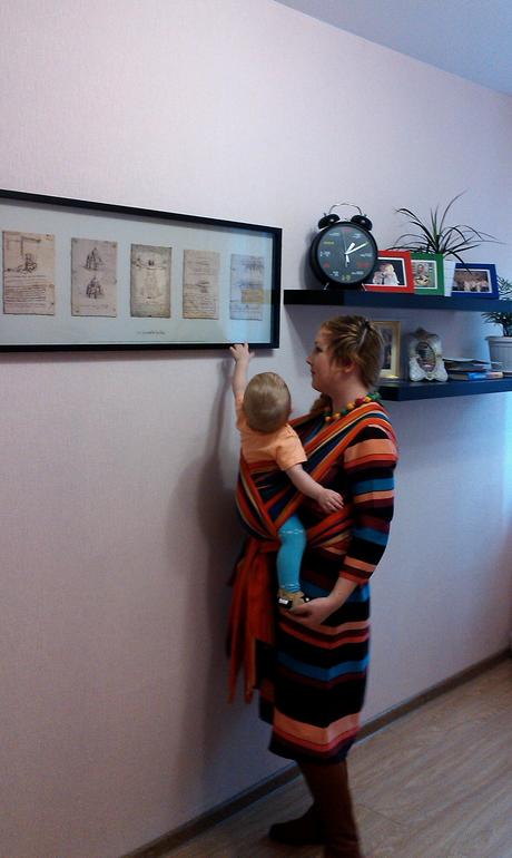 Позировали мы с Софией, рассматривая картины и записи Леонардо Да Винчи. Эта картина из Икеи, когда я укладывала месячную Софию спать и качала во время колик, она всегда пристально смотрела на неё и рассматривала рисунки, и до сих пор она вызывает у неё интерес.