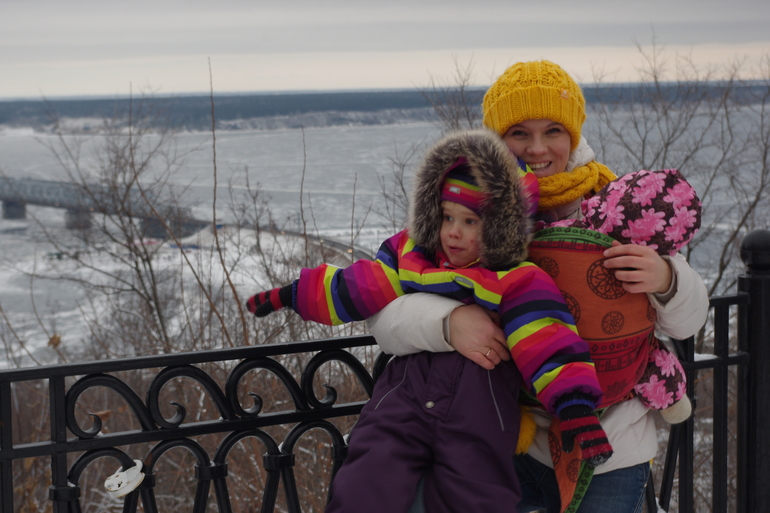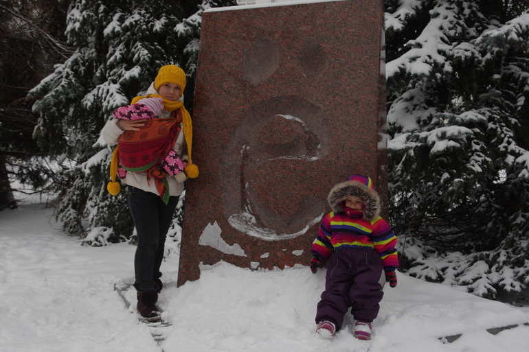 Вот такая прогулка. Фото сделаны за несколько дней! С 2 детьми пешком не много осилишь)) Ну а теперь пару слов о слинге. 1,5 ч прогулки моя спина выдерживала. Но было ужасно не удобно мотать на куртку, намотки ползли. Но ради фото отчета можно и потерпеть. Носили слинг также дома, Мирославу весом в 9 кг с хвостиком несет хорошо! На счет подтягивания показался нормальным. А вот для малышей мне кажется нужно разнашивать! Я тестила еще сш бирюзовые пейсли, вот тот шарф даже новый мне показался мягче, этот же нет. Хотя меня муж уверял, что по плотности оба шарфа одинаковые, но меня не проведешь))))