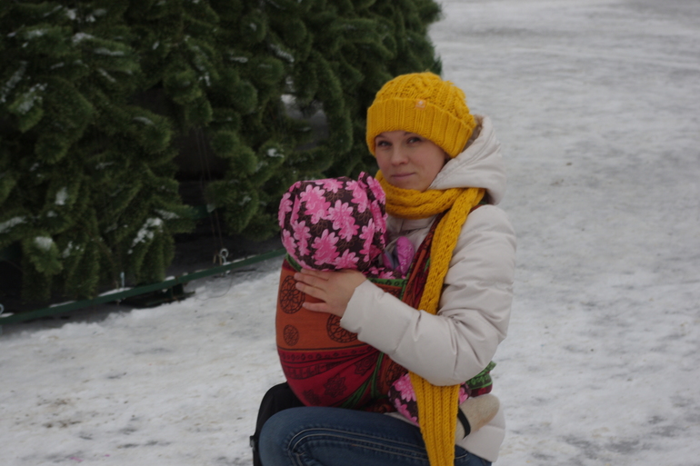 Так как уже не конец октября, а середина декабря, то пришлось мотать на куртку, чтобы слинг был виден на фото! Сходили на ёлку;) Но еще никаких особых красот не нашли, только подготовка!