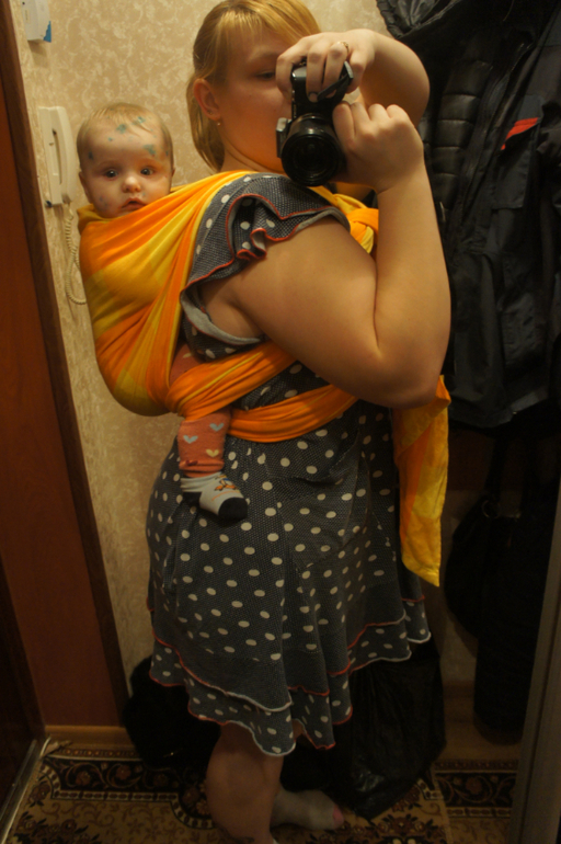 Очень неплохо. Карман поглубже от коленки до коленки, верхнюю треть кармана, плечики притянуть — и будет идеально.По высоте намотке ориентируйтесь — носик малыша на уровне основания Вашей шеи.