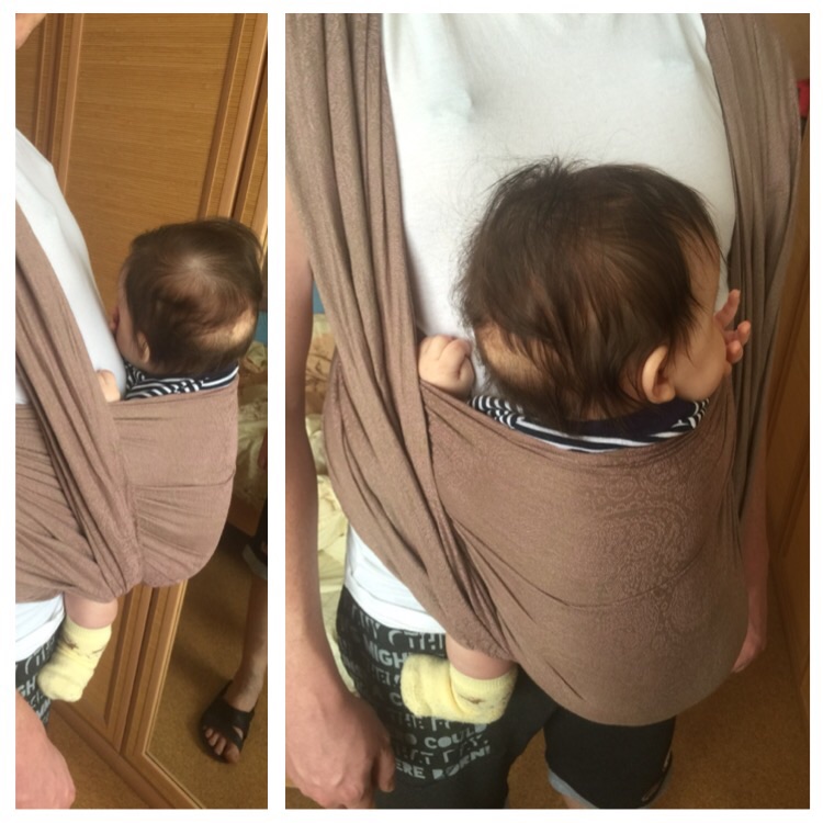 Высота намотки — попа малыша на уровне пупка родителя. И полотна, идущие с плеч, расправьте максимально плоско по бедрам (не по спинке) малыша, иначе они уезжают под коленки. Когда расправите по бедрам сразу поймете. что карман неглубокий и есть слабина в нижней трети — её видно сбоку. Потому глбубоко между малышом и родителем заправляете карман, и подтягиваете всю слабину с плеч, потом эту слабину перегоняете к узлу и перевязываете сзади двойной плоский узел.