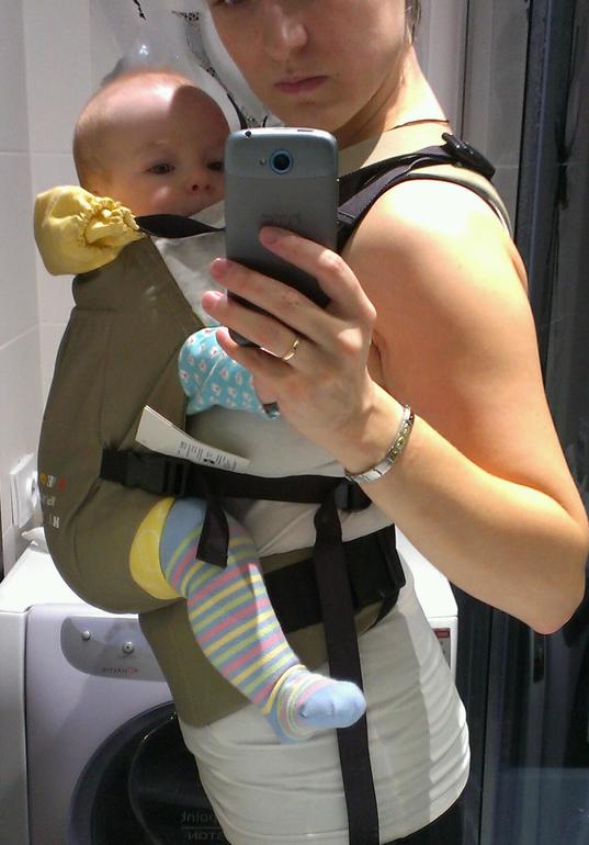 Очень похож на тедди слинг, на мой взгляд.Попробуйте пониже опустить попу над поясом. И взять малыша за голени и свести коленочки вместе. Пока я вижу, что глубины посадки не хватает за счет неглубокой выкройки. За счет чего ножки шире разводятся, а таз несколько прижимается. Соответственно ширины спинки от коленки до коленки не хватает.Вцелом, посадка неплохая.А какие параметры у малыша? По весу и росту, навыкам?