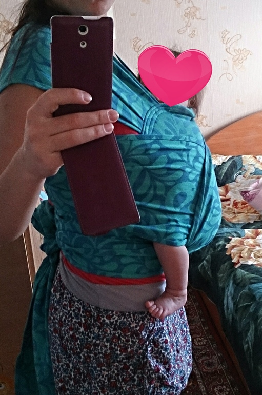 Если нужно, сделайте два перекрута вокруг пояса. Когда накидываете спинку на малыша, не тяните сильно, чтобы перекруты не ликвидировать.И стоит хорошенько вытягивать всю ткань из-под коленки по краю спинки к лямке, и лямку подтягивать. Ведь край спинки задает как раз поддержку коленей.